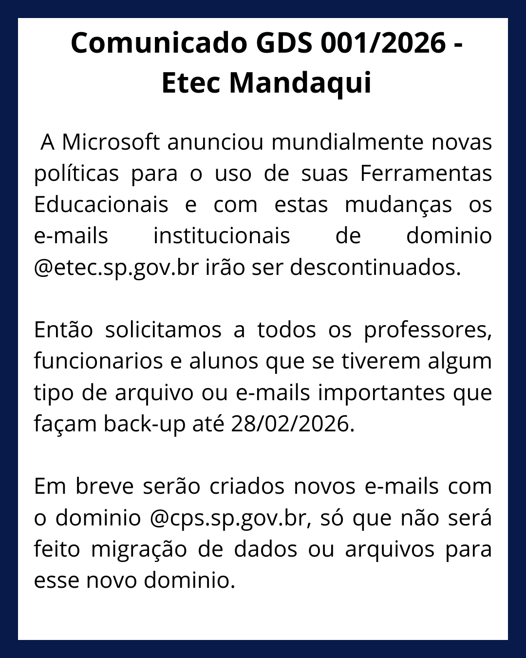 Comunicado referente a descontinuação dos e-mails institucionais @etec.sp.gov.br.